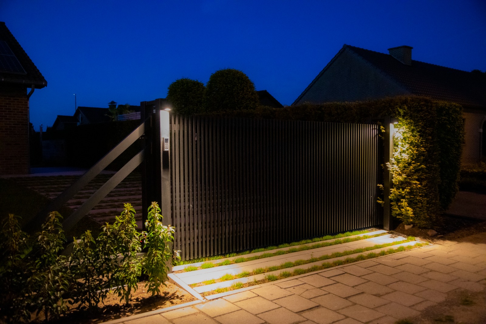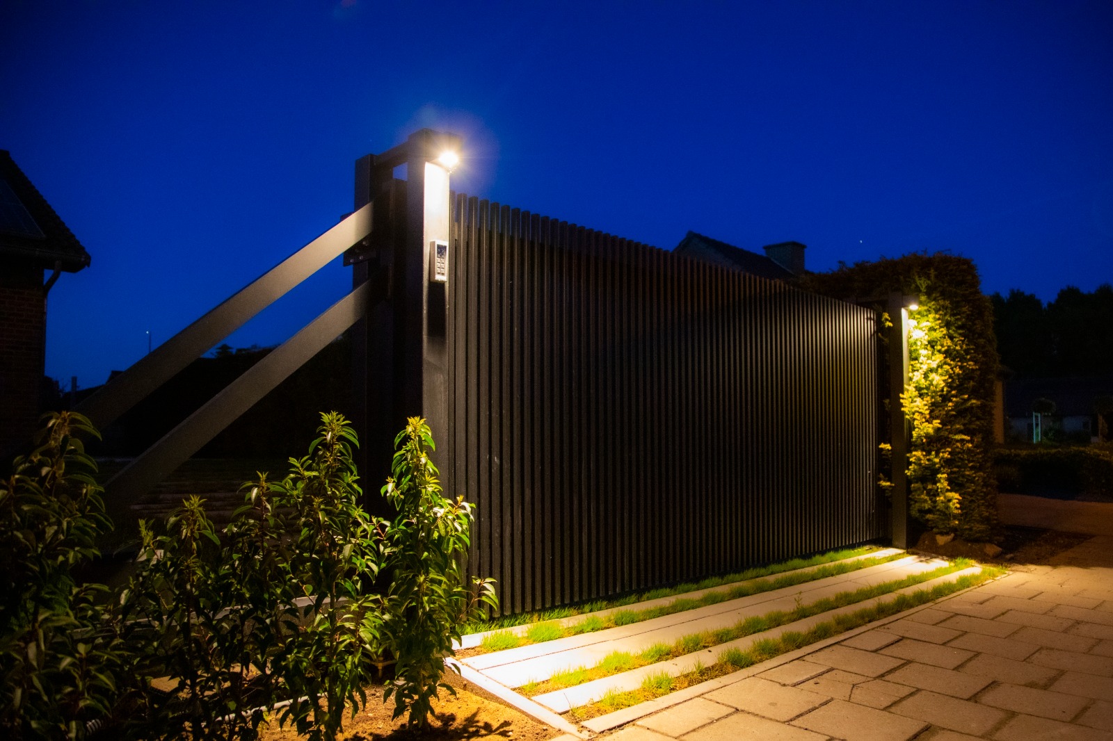 - Vrijdragende Constructie: Geen rails in de oprit nodig, wat zorgt voor een vlotte doorgang en een strakke afwerking van uw bestrating.