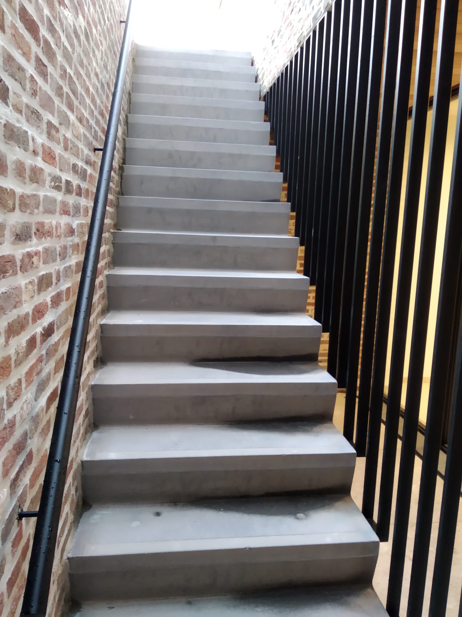 Op de foto zie je hoe onze ronde zwarte muurleuning prachtig contrasteert met een klassieke bakstenen muur, terwijl het verticale spijlenhekwerk zorgt voor een strakke, transparante afscheiding langs de trapzijde. Dit type leuningwerk is de favoriete keuze van architecten voor moderne woningen met een industrieel of minimalistisch karakter.
